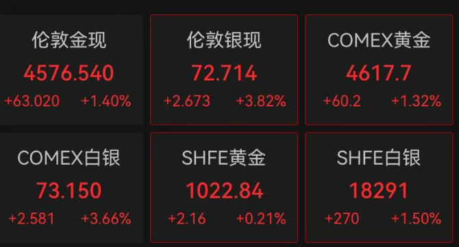 贵金属方面,截至发稿,现货黄金涨1.4%,报4576.54美元/盎司;现货白银上涨3.82%,报72.71美元/盎司。
