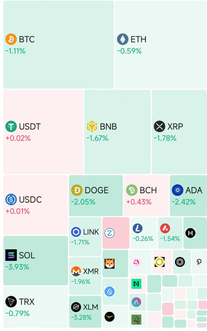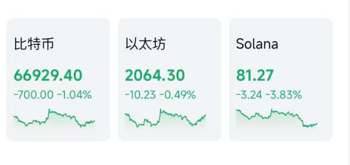 加密货币主要币种集体下跌,截至发稿,比特币跌超1%,最新报66929美元。另外,以太坊跌0.49%,Solana币跌3.83%。