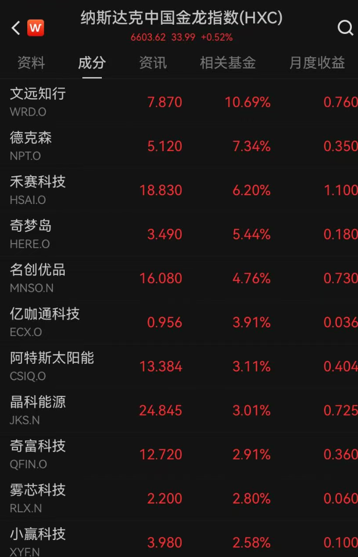 中国金龙指数涨0.52%,其中文远知行涨超10%。