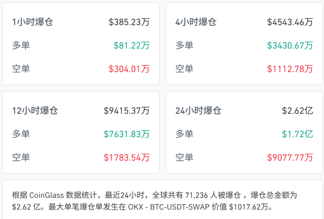 Coinglass数据显示,过去24小时,全市场7万人爆仓,爆仓总金额2.62亿美元。