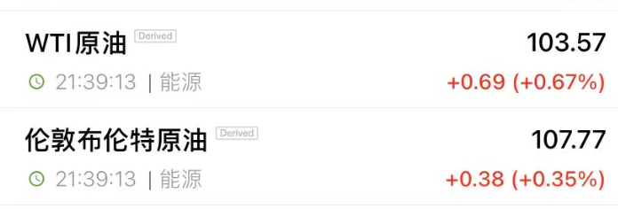 国际油价小幅上涨,美油涨0.67%,报103.57美元/桶;布油涨0.25%,报107.77美元/桶。