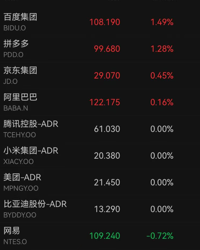 中概股科技龙头中,百度涨1.49%,拼多多涨1.28%,京东、阿里小幅上涨。